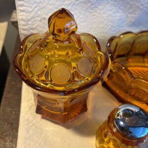 VTG Fostoria Amber Eagle/Torch Coin Glass Covered Compote/Bowl/Salt/Pepper Set