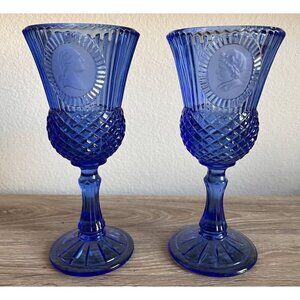 No chips, cracks, or breaks in the glass very good preowned condition, no signs of wear. VTG Fostoria Avon Goblets Stem Cobalt Blue George & Martha Washington 1976. 8" tall.
