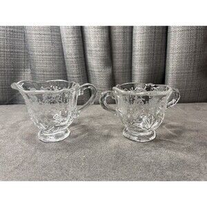 Listing is for a preowned item in good condition, etched design on glass creamer sugar and underplate tray, no cracks or breaks