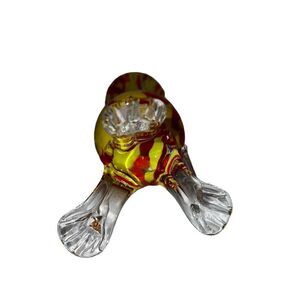 This vintage vase by Franz Welz features a stunning red and yellow spatter design on clear glass strutted tripod legs. The vase stands at 7 3/4 inches tall and was hand blown. The vase is a beautiful example of Art Deco style and is perfect for any decor theme.