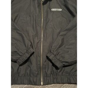 vintage freightliner jacket, american identity destinations oakmont, mens large trucker jacket, y2k promo workwear coat, black bomber logo jacket, freightliner truck gear, 90s outerwear, trucking memorabilia, vintage workwear aesthetic