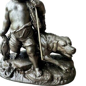 This vintage French-style cast bronze metal sculpture depicts a young boy holding a casting net, fish spear, his stringer of fish and pet puppy dog. The intricate details of the statue make it a one-of-a-kind piece, perfect for any art collection. The artwork features a young figure theme and is made of high-quality bronze material. It has a medium size, measuring 6.75" in length and 3.5" in width. This sculpture is a rare find and would make a great addition to any art enthusiast's collection. This bronze metal sculpture is in Excellent pre owned clean condition with a nice patinated luster with brown green and gold copper color tones with intricate details, has some verdigris oxidation visible on the base and may be coated with a sealant to protect the metal. Please review the pictures for more details and size measurement information, thank you.