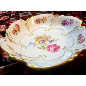 GRAF VON HENNEBERG Jlmenau Floral with Gold Gilt Accents and Edge Trimming. Colorful floral and a deep pink Rose with no fading. Perfectly preserved, the gold gilt is fresh, deep, and the curves and contours of the scalloped edges are perfect like new.