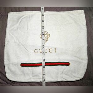 Keywords: Gucci dust bag, luxury storage bag, Gucci logo, Italian flag dust bag, Gucci drawstring bag, Gucci with gold bead accents, designer dust bag, accessory storage