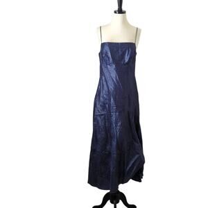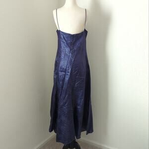 Gai Mattiolo women's dress, Italy 46. US 12. made in Italy. 66% linen 34% nylon shimmery glittery midi gown spaghetti strap zipper back blue purple ruffle bottom empire waist unique cut artsy funky