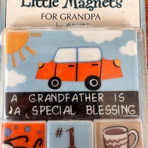 This set of magnets features Grandpa..has the words(on large magnet)"A Grandfather is a Special Blessing". The smaller magnets have glasses, a coffee cup and a hat. The larger magnet has an orange car design