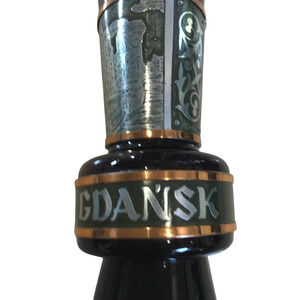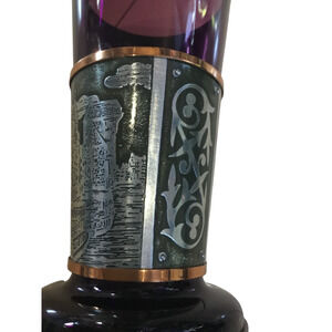 Beautiful vintage souvenir glassware set from Gdańsk, Poland, featuring a richly colored amethyst glass pitcher and matching goblet with engraved metal relief panels. Highlights include “Brama Wyżynna” and other iconic architecture from Gdańsk, wrapped in metallic detailing with copper-tone trim. Unique decorative pieces for collectors of European travel memorabilia, Polish heritage items, or vintage glass.
