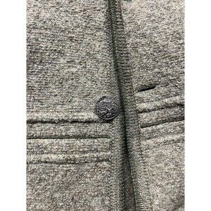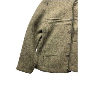 The VTG Geiger Tyrol Pure New Wool Sweater Jacket is a women's size large green cardigan with a vintage feel. Made in Austria, this short jacket features a solid pattern with button closure and long sleeves. It is perfect for various occasions including travel, parties, casual outings, or formal events. The jacket also has embroidered accents and side ribbed detailing, giving it a unique and stylish look. With its boiled wool construction and knit fabric, this jacket is both comfortable and fashionable, suitable for all seasons.