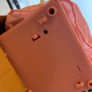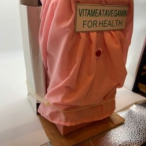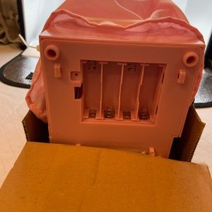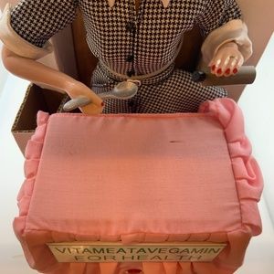 This animated doll is in nearly perfect condition, aside from some light wear. There is one small blemish on the tabletop, as shown in the photos, but otherwise it is in perfect condition and in working order. One zip tie on the bottom is missing, but the doll is still in the original packaging. The box also shows some light wear from age and a small indent on the front window. This doll is a rare find and is an amazing addition to any collection!