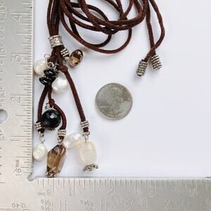 Features: Long brown suede leather cord; cluster of mixed gemstone and pearl dangles; faceted and smooth shapes; ornate silver tone spacer and bead caps; neutral color palette with warm and cool tones