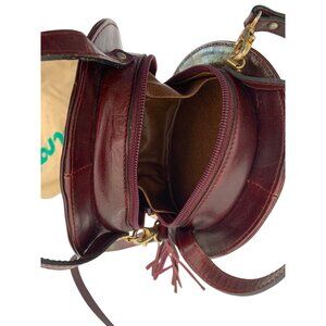 Crafted with handmade precision in Italy, this genuine leather round crossbody bag from Bettina offers a sleek design with a practical interior. Its rich burgundy hue and elegant tassel detail make it a sophisticated accessory, suitable for both casual and formal settings. Most likely a treasure brought home from vacation in Italy.