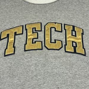 Oversized cropped sweatshirt featuring Georgia Tech college logo. This gray sweatshirt has a raw hem and short sleeves, giving it a modern, edgy look. The gold and navy "TECH" lettering is bold and eye-catching, perfect for showing off your school spirit. The oversized fit makes it comfortable and easy to wear, while the cropped length adds a trendy touch. This sweatshirt is ideal for casual outings, game days, or relaxed weekends.