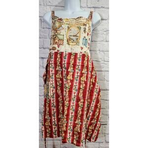 red, multicolor, gingerbread man print, Vintage, single front pocket, full apron, tie back, lightweight, cute