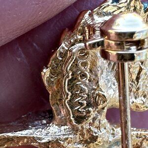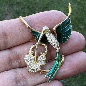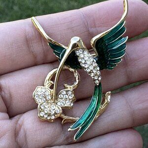This vintage brooch pin features a beautiful hummingbird design with a flower shape, perfect for any anniversary or birthday occasion. This 2" signed by Giovanni with maker's marks brooch pin is made of yellow gold plated metal with green enamel fill and clear round rhinestones. The hummingbird is harvesting nectar out of a blooming flower. This mid century modern item is in good pre owned clean condition with minor use wear, the pin clasp closure functions properly and it has all original stones. Please review pictures for more details and size measurement information, thank you.