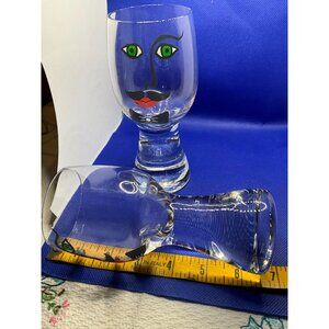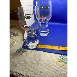 Cheers to good times with these vintage whimsical glasses. Each glass features a quirky face with vibrant green eyes, a cheerful mustache, and a dapper bowtie. Each stands 6.5" tall.