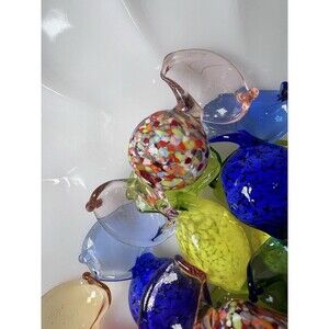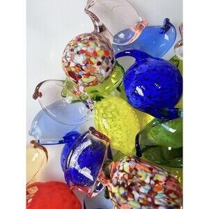 This is a collection of hand-blown glass candy pieces in vibrant multi-color, inspired by Murano style Italian glass. Each piece is approximately 3 inches long, making them a unique and colorful addition to any decorative collection. Made from high-quality glass, these candy pieces are a beautiful and eye-catching display for any collector or lover of decorative art. Perfect for adding a pop of color and creativity to any space, these handcrafted pieces are sure to stand out in any decor.