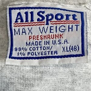 The VTG God Bless America T-Shirt in size XL with the All Sport Tag is a vintage piece featuring a classic design with a crew neck and short sleeves. Made from comfortable cotton material in a timeless gray color, this regular fit shirt is perfect for men who appreciate sports-themed clothing. The shirt proudly displays the theme of God Bless America, making it a patriotic and stylish addition to any wardrobe. Made in the United States, this T-shirt embodies quality craftsmanship and a nostalgic aesthetic.