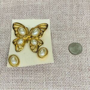 VTG Gold Butterfly Pearl Brooch Earrings Set