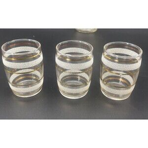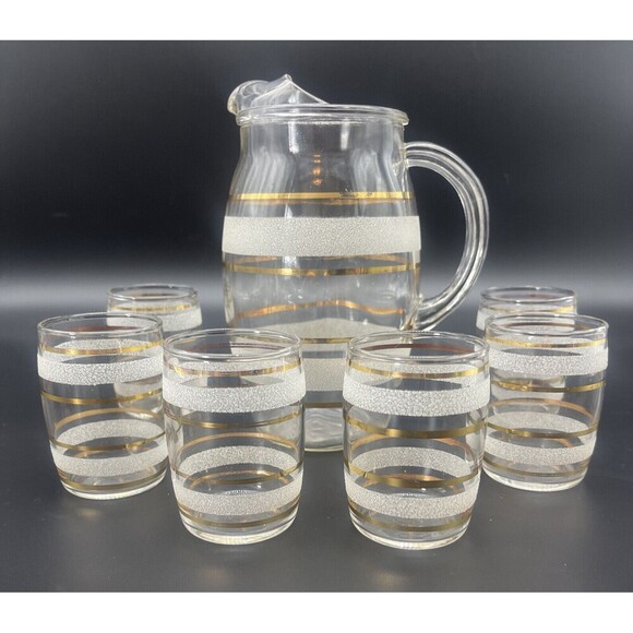 1950s MCM Gold and Frosted Pitcher And Six Glasses Set. Alternating Gold and Frosted Stripes, 6 Low Ball Tumblers or Juice Glasses, Excellent Used Condition with a Few Minor Wear Spots on the gold stripes Due to Age. There are no chips or cracks. Glasses Measure Approximately 3" T x 2.25" W & the Pitcher Measures Approximately 7" T x 6" Wide including Handle. Please see photos for an accurate depiction of condition. Please reach out with any questions you may have.