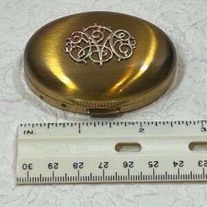 Vintage Germaine Monteil oval brass powder compact with a raised filigree monogram design on lid