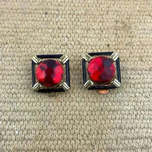 VTG Gold Tone Clip On Earrings Red Rhinestone Center Square