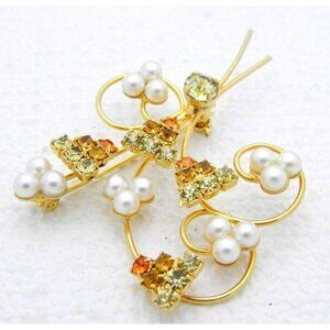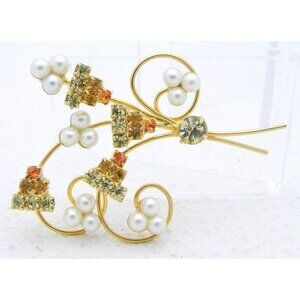VTG Gold Tone Faux Pearl Yellow Orange Rhinestone Flower Pin Brooch