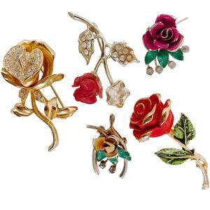 How does your garden grow? Charming set of 5 vintage floral brooches blooming with mid-century character—each rose sculpted in metal and enamel, some twinkling with rhinestones. A sweet mix of traditional elegance and playful color. Perfect for Mother's Day.
