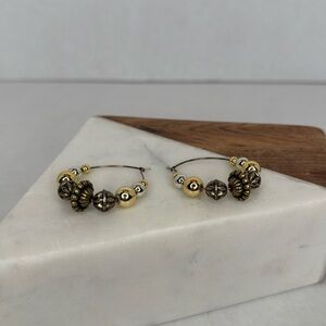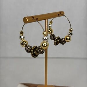 Vintage gold tone post back earrings hoop bead earrings. In good vintage condition with some darkening on the beads. Possibly vintage brass. Really sleek and modern. The colors are silver, gold, and brass.