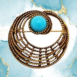 VTG Gold-Tone Filigree Circle Brooch w/ Faux Turquoise Cabochon Retro Statement
