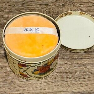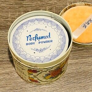 Inside the original powder carton has been punctured in the top so just a small amount of powder comes out. The container feels almost full. The original puff is included. Made by The Lander Company Inc, Fifth Ave, New York. Container is marked 12 oz, and this weighs 16.05 oz total weight. The tin container has floral graphics, and has some rusting and discoloration from age.