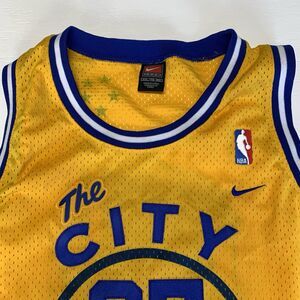 The product is a vintage Golden State Warriors Nick Van Exel jersey by Nike in size 2XL. This swingman NBA jersey is officially stitched and features the team's iconic colors of yellow. Perfect for basketball fans looking to represent the Golden State Warriors and show their support for Nick Van Exel during his career in the NBA. H1
