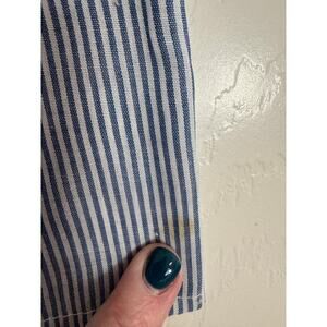 Adorable & still vibrant, navy suspender skirt and striped button up Peter Pan collared shirt with bow detail. Dead elastic in sleeves- untreated spot on shirt as pictured, buttons are a little tarnished