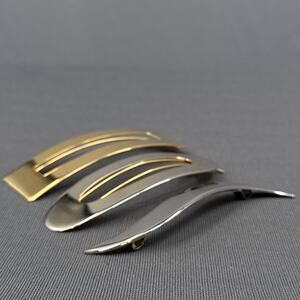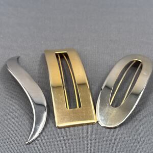 • Features/Accents: Set of 3 includes: silver Goody barrette stamped “GOODY PATS. PENDG.” with sculptural curved shape, plus 2 unbranded late 90s/Y2K metal barrettes — 1 silver oval cutout, 1 gold rectangular cutout. Sleek and modernist look fits retro, minimalist, and classy styling.