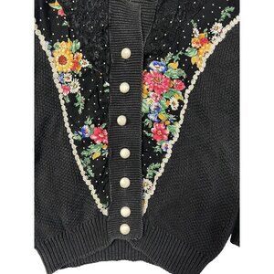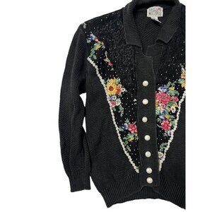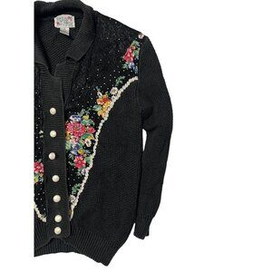 Black knit with floral and sequin detail on chest. Collared, Pearl-style buttons. The ultimate grandma sweater!