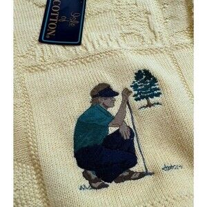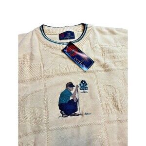 Awesome new old stock Golf Sweater! In the last photo - you can see a black thread - I believe it can be cut out, but I didn't want to try since it is brand new. It is very small on the back of the right arm. It has raised, embossed type pictures of golf themed things. It is so cool. Grandpacore - Cottagecore - Preppy - Chunky - Bright - Original - Y2K - 90's - 80's - Made in USA - Vintage
