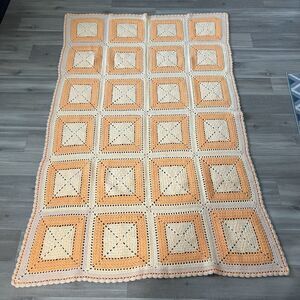 VTG Granny Square Crochet Afghan Quilt Blanket Throw Orange Peach 48” x 74”
