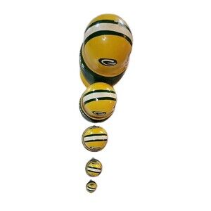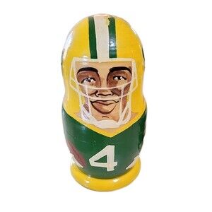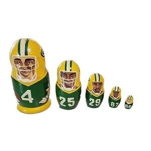 The product is a set of Green Bay Packers matryoshka, nesting dolls featuring legendary quarterback Brett Favre. These dolls are a unique and charming way for fans of the team to display their support for both the Green Bay Packers and Brett Favre. Perfect for collectors or fans looking to add a special touch to their fan apparel and souvenirs collection, these nesting dolls are a must-have for any football enthusiast.