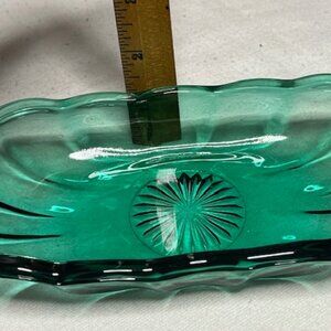 VTG Green Glass Scalloped Edges Intricate Center Design Oval Oblong Serving Dish