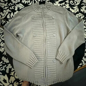 Nice Vintage Guess Textured Knit Button Zip Up Y2K Sweater Jacket, size XL. Has weight to it so it’s perfect for chilly fall & winter weather. Really great vintage condition. Nice detailing with buttons and trim going down the front of the sweater. Great neutral grey.