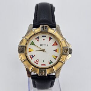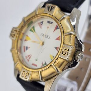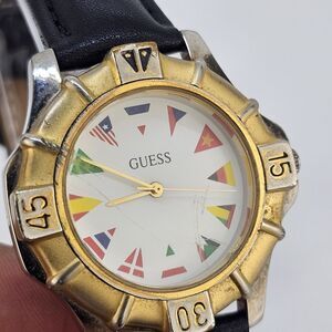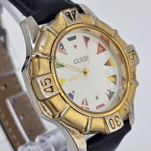 VTG Guess Unisex Watch 38MM Worlds Flags White Dial New Black Bands New Battery