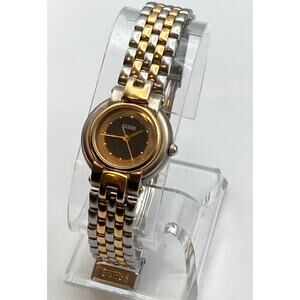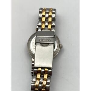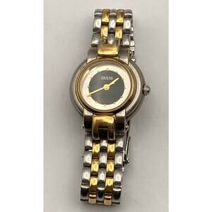 Add a touch of vintage charm to your wrist with this Guess women's watch! This timepiece features a classic design with black, gold, and silver tones that complement any outfit. The watch has a 25mm case and fits wrists measuring 4.75-5 inches. A new battery has been installed, so it's ready to wear and enjoy. This watch would make a wonderful addition to your jewelry collection!
