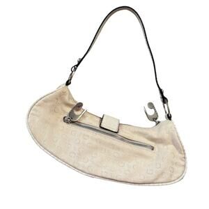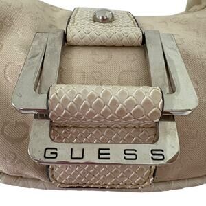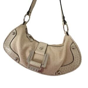 Authentic Guess vintage Y2K baguette shoulder bag in a soft cream tone with allover monogram print. Features snake-embossed faux leather trim, silver-tone hardware, signature Guess front buckle detail, and a curved mini hobo silhouette. Zip-top closure with branded zipper pull. Interior includes a fabric lining with a zip pocket, perfect for daily essentials. Iconic early-2000s design that sits comfortably under the arm, ideal for Y2K, coquette, soft glam, and vintage outfits.
