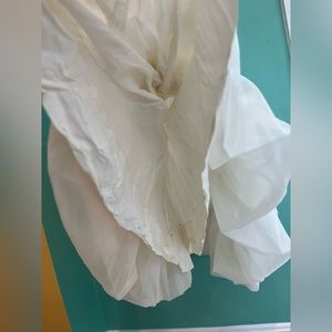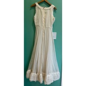 This has been altered and the tags removed. The bodice was made bigger and the sleeves removed. The seams are unfinished where the sleeves were removed, so you’ll need to make a hem along the armholes. There are 3 layers and the one just below the Swiss dot mesh has a great poofy detail that adds to the skirts’ volume. As it is, waist measures 13”, underarm across is 16.5-17”, length is 52”. The last pic shows some dirt near the bottom, I actually wore this in college for a feminist performance art piece with other women