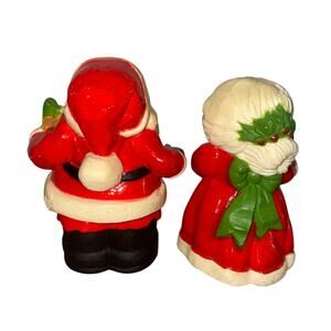 Spice up your Christmas table with these vintage Hallmark salt and pepper shakers featuring Mr. and Mrs. Santa Claus. Made of durable plastic, these shakers are perfect for the holiday season and beyond. The multicolor design adds a festive touch to any table setting. It has a faint yellowish tone where the white was due to its age.