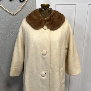 Gorgeous π€© Handmade Vintage 50/60βs? Faux Fur Jacket with Real fox fur detachable collar. Three large buttons down front & two front pockets on sides. One pocket does have a few stitches loose. 3/4 length sleeves. Interior of jacket does have some stains and and a few on outside of coat as seen in pics. Collar attachments have been torn so needs repaired to be able to wear fox fur collar. Jacket. Is not perfect please check out all pics measurements & video and comment below with any questions. No tags/size tags but fits Large. Or oversized medium