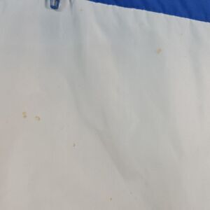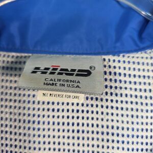 The VTG HIND Track Suit Pullover Jacket and Pull On Pants in Size M 4060 are a vintage set from the 1980s, featuring a blue and white color scheme made of nylon material. This unisex windbreaker is designed for everyday wear and has a sportswear/beach look, perfect for casual occasions. The jacket has long sleeves and a regular fit, with original styling by the brand Hind. Made in the United States, this retro outerwear set is a stylish addition to any wardrobe looking to add a touch of vintage flair.