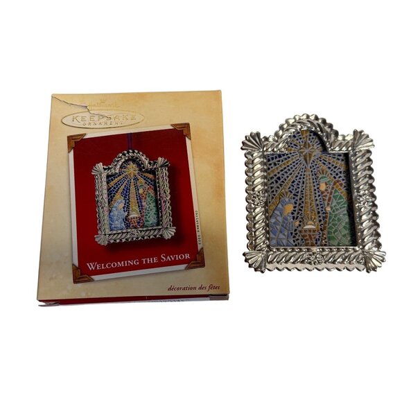 Christmas ornament, nativity scene, Hallmark Keepsake, religious decor, handcrafted metal, stained-glass style, holiday decoration, Christmas gift, collectible ornament, 2002 Hallmark, Christian holiday, Christmas keepsake, Welcoming the Savior
