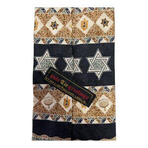 Celebrate the Festival of Lights in style with this vintage Hallmark Yule Tie Greetings necktie. Featuring a bold Hanukkah-inspired design with menorahs, dreidels, Stars of David, and festive geometric patterns, this unique tie captures the spirit of the holiday season.