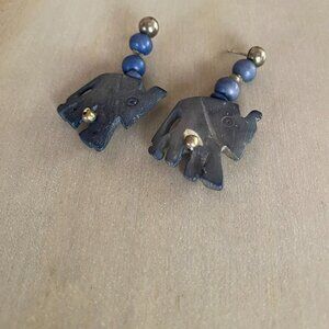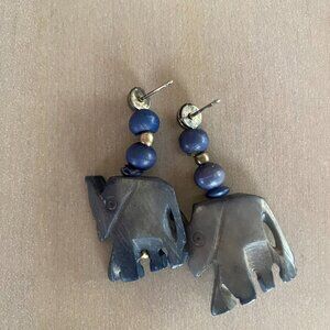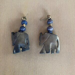 VTG Hand Carved Bovine Bone Blue Elephant Boho Dangle Earrings 70s festival