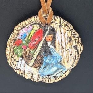 VTG Hand Carved Painted Native Girl Pendant Necklace 26"
